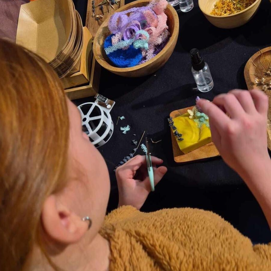 Kinderen gaan aan de slag met het decoreren van natuurlijke olijfzeep. Ze gebruiken droogbloemen, geurige kruiden en etherische olie om hun eigen zeeptuintje te maken. Daarna leren ze hoe ze hun creatie duurzaam kunnen verpakken — met papier, lint en stempels.